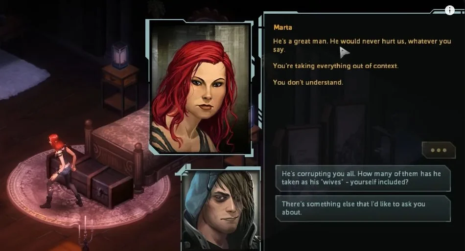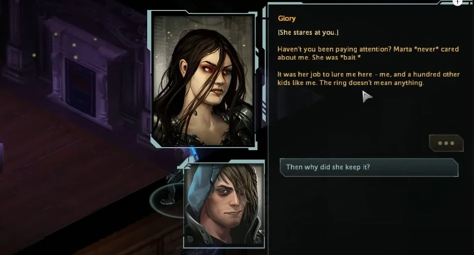 Confronting the acolytes as foreshadowed, is a tougher fight. Afterwards you can share more memories of Marta with Glory and find a ring from happier times. Gaining the ring enables a Marta Point in her confrontation conversation. Note that discoveries that enable conversation options to gain Marta Points are not communicated to you when found.